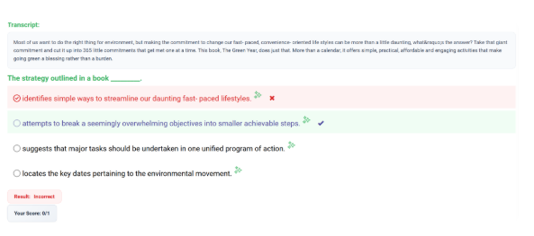 Got a multiple-choice wrong? It shows the trap: “Option A was mentioned as something the speaker disagrees with, therefore it’s a trap.” Plus, the Evidence Locator shows you the exact part of the audio that contained the correct answer.