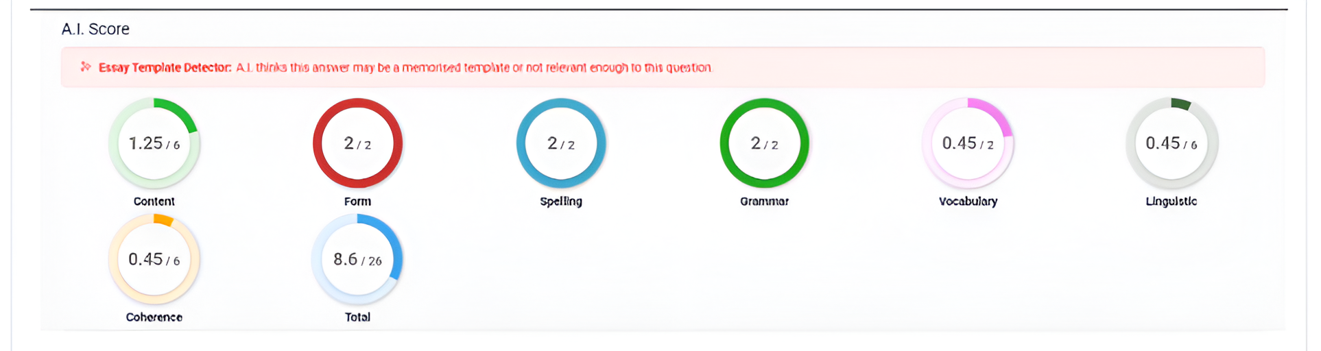 Real-time scoring breakdown matching Pearson’s exact criteria: